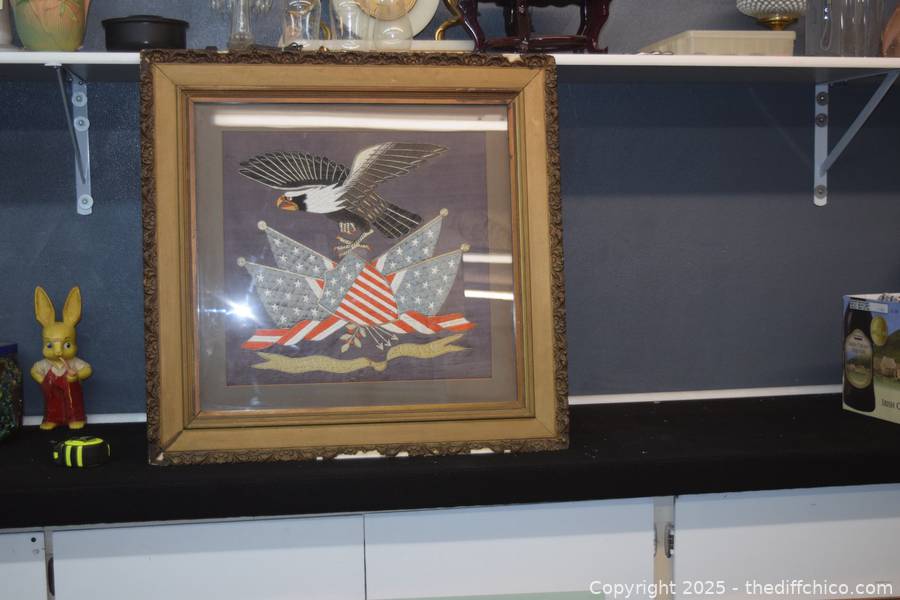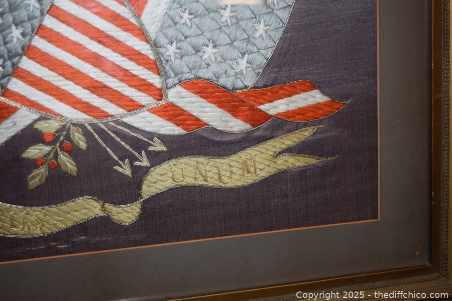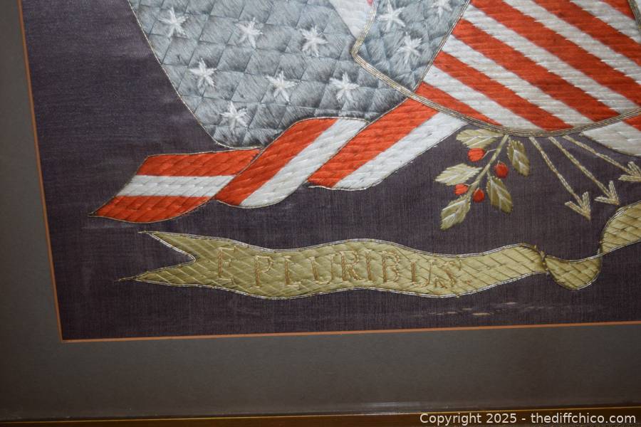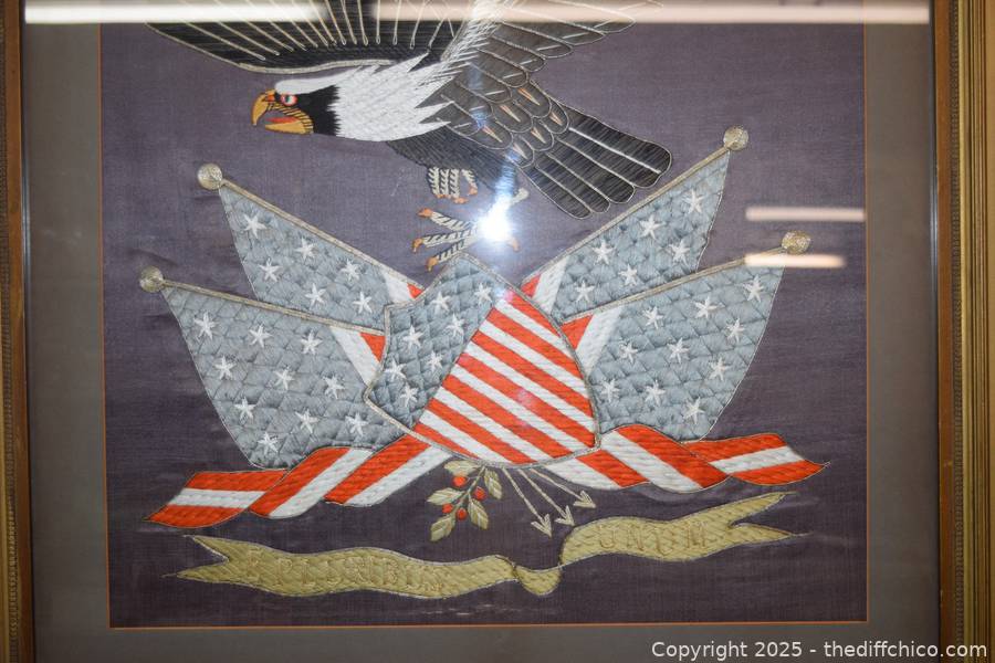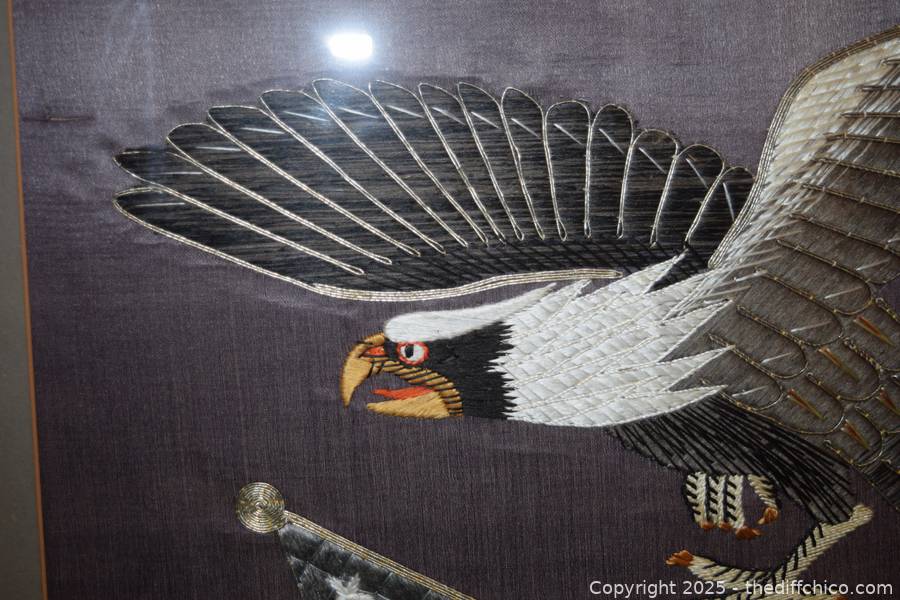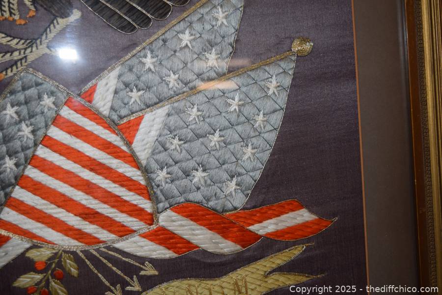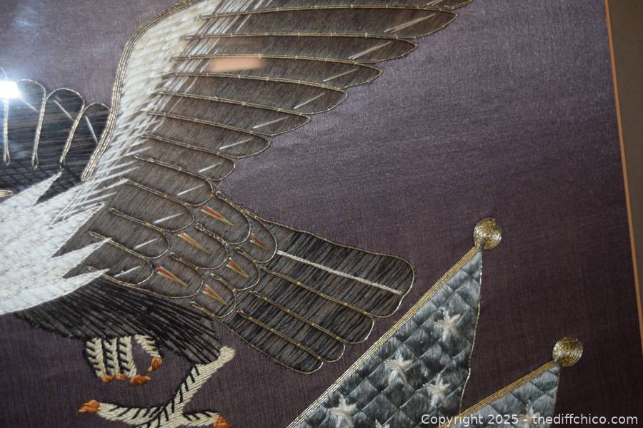 Framed Patriotic American Eagle Silk Embroidery - 30in x 29in