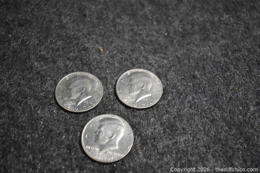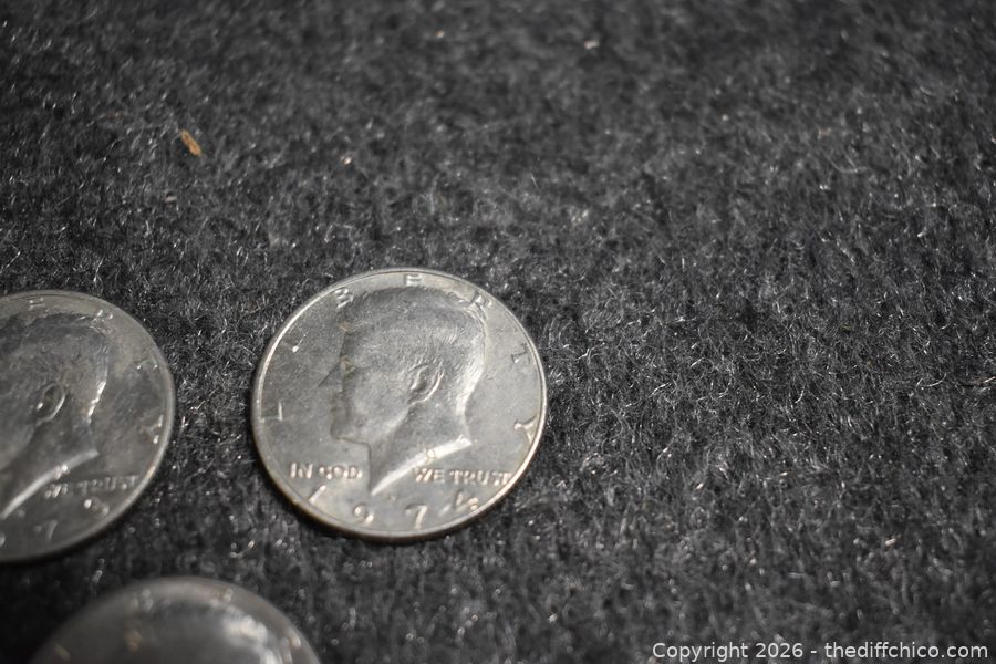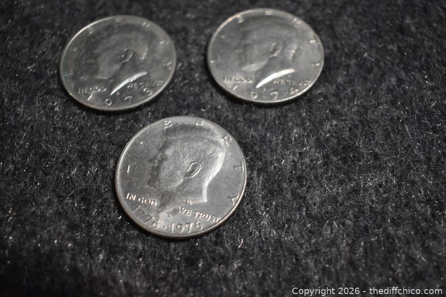 Three Kennedy Half Dollars-1973, 1974 and Bi Centennial 1776-1976